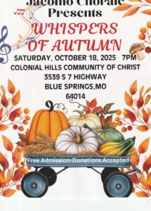 JACOMO Chorale starts it’s 33rd year on Thursday night August 18th at 7 pm at the Mission Woods Community of Christ church. All are welcomed.